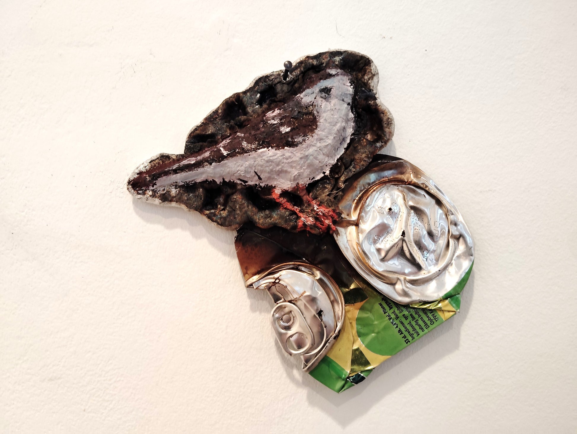 Genbrugsaluminium støbt i sandform, øldåse, tyggegummi, oliemaling